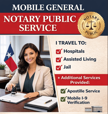 I provide Mobile General Notary Public Services, Mobile I-9 Verification Service, Document Courier, Permit Running, and Depositions.