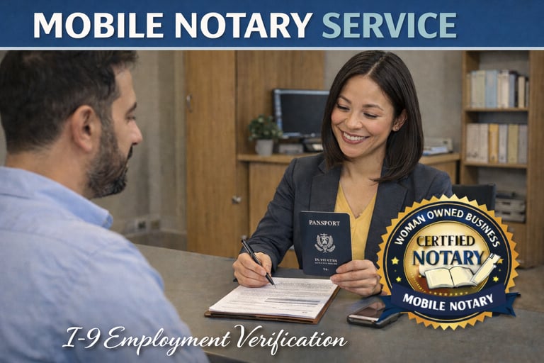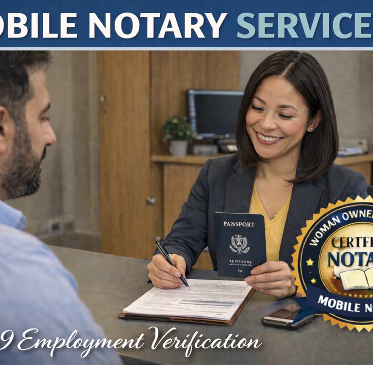 Sparx Notary Services provides mobile I-9 Employment Eligibility Verification services, acting as an Authorized Representative for employers who need Section 2 of Form I-9 completed accurately and on time.